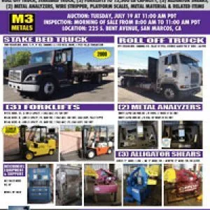 FEATURING: ROLL OFF TRUCK, STAKE & FLATBED TRUCKS, FORKLIFTS TO 12,500 LBS. CAPACITY, (3) ALLIGATOR SHEARS, (2) METAL ANALYZER GUNS, WIRE STRIPPER, PLATFORM SCALES, METAL MATERIAL AND RELATED ITEMS