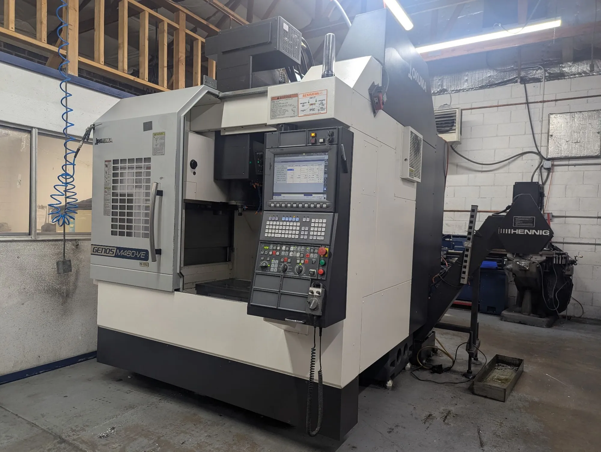 2021 OKUMA GENOS M460-VE CNC VERTICAL MACHINING CENTER, S/N 235494, OKUMA OSP-P300MA INTUITIVE TOUCH SCREEN CONTROL, 15,000 RPM SPINDLE, RENISHAW PROBING WITH TOOL SETTER, 32 ATC, CAT40, DAIKIN INVERTER, ***CUTTING TIME 2247 HRS***, DUAL CHIP AUGER, 2020 HENNIG CHIP CONVEYOR 102340 MB-460V-1000, S/N 601003-000A