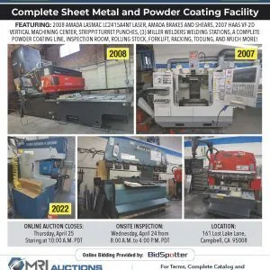 COMPLETE SHEET METAL FACILITY AND POWDER COATING FACILITY COMPRISED OF AMADA BRAKES AND SHEARS, STRIPPIT TURRET PUNCHES, ALL SIZES OF MILLER WELDERS, A COMPLETE POWDER COATING LINE , INSPECTION ROOM, ROLLING STOCK, FORKLIFTS, RACKING, HAAS MACHINING CENTER, TOOLING, AND MUCH MUCH MORE!!!