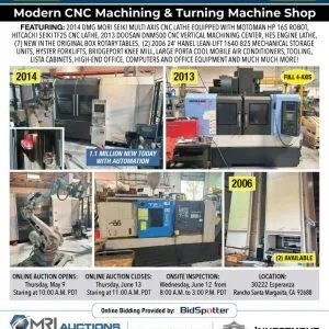 FEATURING: 2008 Amada LASMAC LC2415A4NT Laser, Amada RG-35S & Amada RG-50 Press Brakes, 2007 Haas VF-2D Vertical Machining Center, 2022 Pemserter Series 4 Hardware Insertion Machine, Haeger 824-1L Hardware Insertion Machine, Wysong Mechanical Shear, Strippit Turret Punches, (3) Miller Welders Welding Stations, a Complete Powder Coating Line, including: Heat Treat Walk In Furnace, Spray booth and spray gun system, 2017 Global Finishing Solutions Industrial Finishing Booth, Inspection Room, Rolling Stock, Forklift, Racking, Tooling, And Much More!