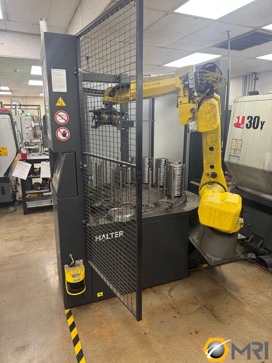 FANUC/HALTER M-20iA Robot and Stacker, 2020 used industrial robot, equipped with Halter Turn Stacker Premium 20 Bundle, gripper package, cables, and control. Ideal for enhancing automation with reliable features to optimize your operations.