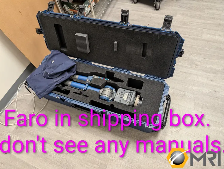 Used FARO GAGE coordinate measuring device with 1.5m working volume, universal quick mount, multi-probe capability, and internal counterbalancing. Includes granite table, tools, notebook, Verisurf CAD software, and magnetic mount.