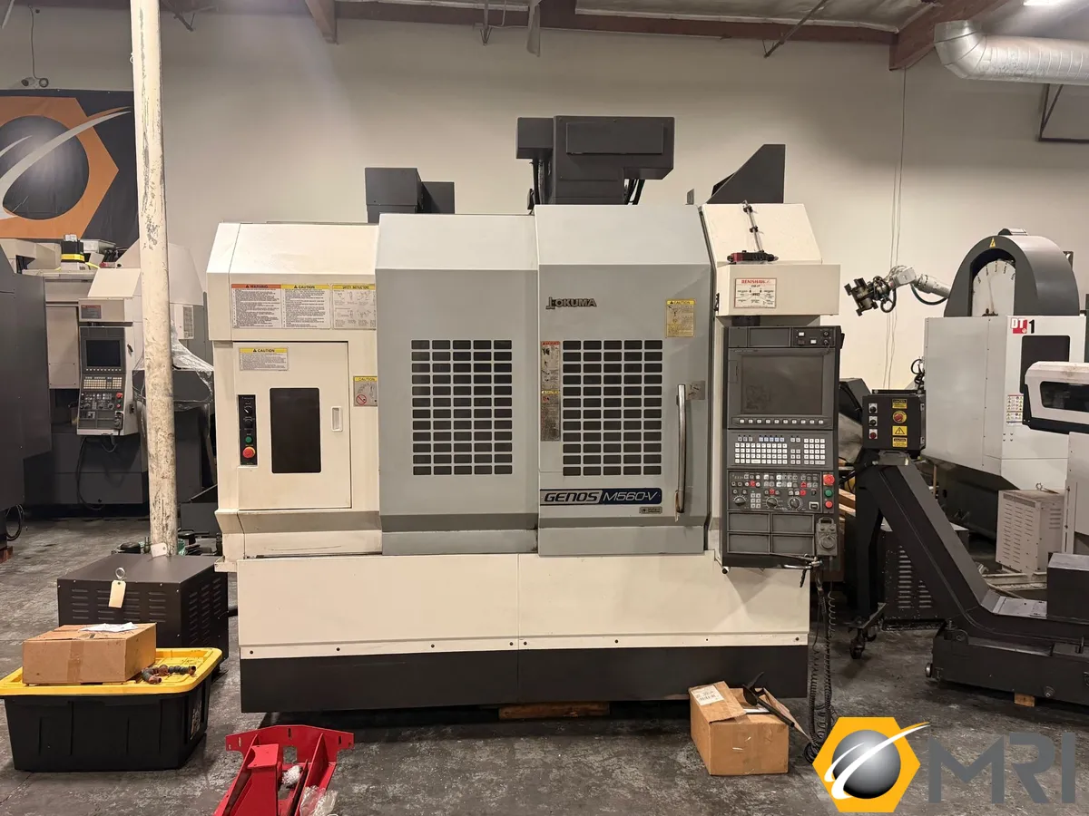 2017 OKUMA GENOS M560-V in used condition, ideal for precision work. Features 41x22x18" XYZ travel, 25 hp, 15,000 RPM, CAT 40 taper, and 32-tool capacity. Includes RENISHAW PROBING OMP40, Table Probe, Mayfran Chip Conveyer, and Dual Auger.