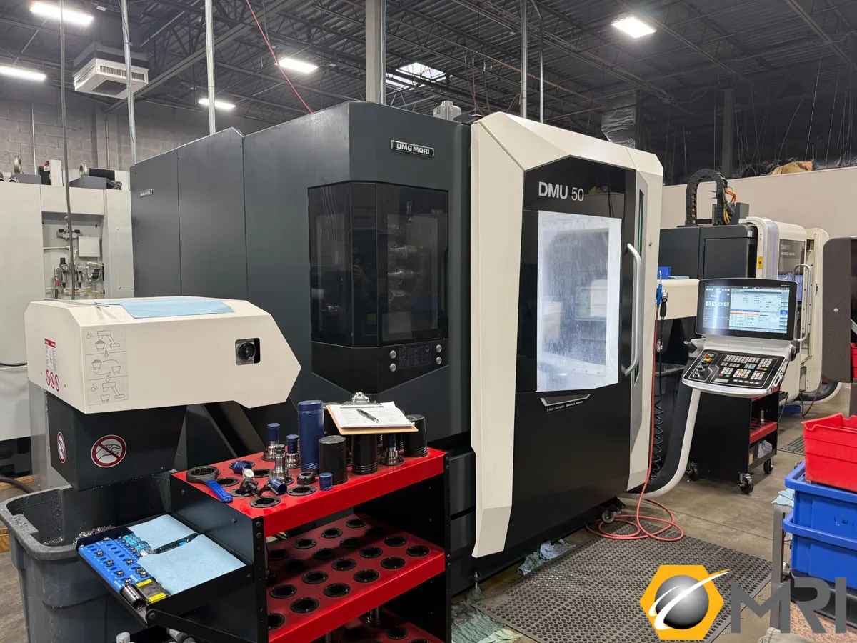 2020 DMG MORI DMU 50 GEN III 5-AXIS Vertical Machining Center, used, featuring 25.6" X, 20.47" Y, 18.7" Z travel, 20000 RPM spindle speed, 60-tool capacity, Siemens control, and high-pressure coolant system. Ideal for precision tasks in professional settings.