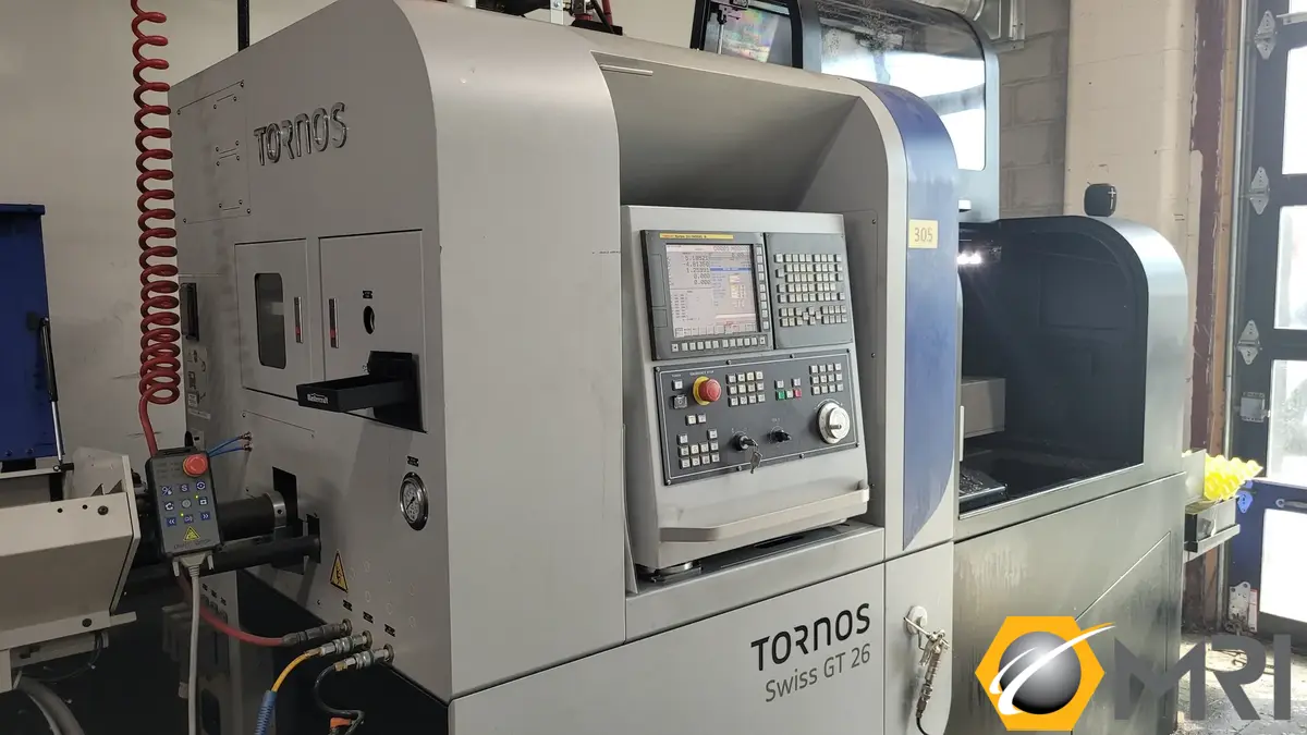 2021 TORNOS SWISS GT 26 CNC Lathe, used, with 8 axes, 11 hp, and 10,000 RPM spindle. Features include 12' Iemca barfeed, Mist-Fit MF550, TISIS Software, and Fanuc 31iB control. Cutting hours: 435. Suitable for precision machining tasks.